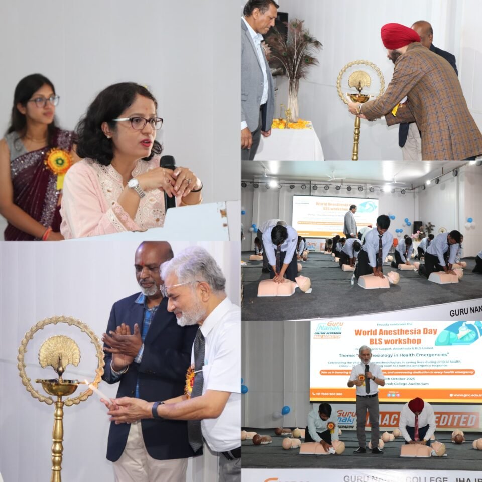 देहरादून, गुरु नानक कॉलेज ऑफ़ पैरामेडिकल साइंसेज़, देहरादून के ऑपरेशन थियेटर टेक्नोलॉजी विभाग में  विश्व एनेस्थीसिया दिवस 2025 उत्साह और गंभीरता के साथ मनाया गया। कार्यक्रम का उद्देश्य आधुनिक चिकित्सा प्रणाली में एनेस्थीसिया विशेषज्ञों की अहम भूमिका को रेखांकित करना और छात्रों को जीवनरक्षक तकनीकों का प्रशिक्षण देना रहा।
