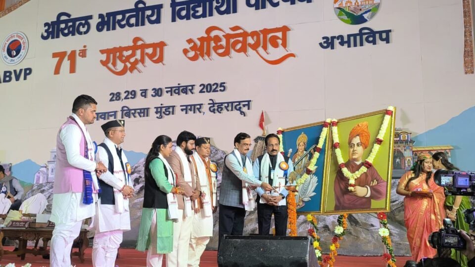 देहरादून ,अखिल भारतीय विद्यार्थी परिषद (अभाविप) के 71वें राष्ट्रीय अधिवेशन का भव्य शुभारंभ देहरादून के परेड ग्राउंड में अस्थाई रूप से बसाए गए ‘भगवान बिरसा मुंडा नगर ‘ के ‘जनरल विपिन रावत रावत सभागार’ में भारतीय अंतरिक्ष अनुसंधान केंद्र (इसरो) के पूर्व अध्यक्ष डा.. एस सोमनाथ ने किया। इस अवसर पर अभाविप के नवनिर्वाचित राष्ट्रीय अध्यक्ष प्रो. (डा.) रघुराज किशोर तिवारी, पुनर्निर्वाचित राष्ट्रीय महामंत्री डा. वीरेंद्र सिंह सोलंकी, अभाविप की राष्ट्रीय मंत्री कु. क्षमा शर्मा, अभाविप राष्ट्रीय अधिवेशन की स्वागत समिति अध्यक्ष एवं ग्राफिक एरा विश्वविद्यालय के संस्थापक अध्यक्ष डा. कमल घनशाला, स्वागत समिति महामंत्री एवं उत्तराखण्ड जलागम परिषद के उपाध्यक्ष रमेश गाड़िया, उत्तराखण्ड अभाविप प्रांत अध्यक्ष डा. जे.पी. भट्ट एवं उत्तराखण्ड अभाविप प्रांत मंत्री ऋषभ रावत मंच पर उपस्थित रहे।