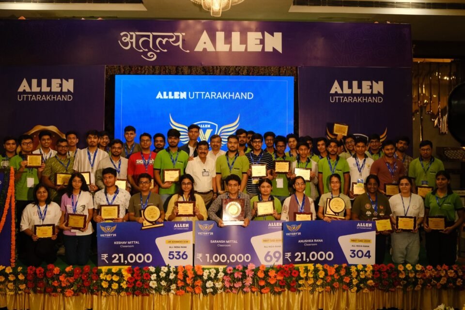 अदीबा नदीम (ऑल इंडिया रैंक-2582),तुषार कुमार (ऑल इंडिया रैंक-3133), अर्श गुसाईं (ऑल इंडिया रैंक- 4065) शामिल थे। साथ ही इस सत्र में उत्तराखंड से एनएसईजेएस के तीनों चयनित विद्यार्थी एलेन के ही छात्र थे, जिन्हें इस विक्ट्री सेलिब्रेशन के दौरान सम्मानित किया गया। इनमें निर्मय प्रताप सिंह,आर्यमन चौबे, रुद्राक्ष रावत शामिल है। वहीं इससे पूर्व गणेश वंदना के साथ कार्यक्रम की शुरुआत की गई। इसके पश्चात एलेन देहरादून के छात्रों एवं शिक्षकों द्वारा एकल शास्त्रीय नृत्य प्रस्तुत किया गया। इसके पश्चात सदानंद वाणी का प्रेरणादायक भाषण हुआ, जिसमें उन्होंने इस फलदायी यात्रा की नींव रखने वाली सोच पर प्रकाश डाला। एलेन के वाइस प्रेसिडेंट सदानंद वाणी ने कहा कि अभिभावकों द्वारा संस्था में दिखाए गए विश्वास के लिए वह आभारी हैं। उन्होंने बताया कि अलग-अलग शाखाएं खोलने का उद्देश्य छात्रों को कोटा में दी जाने वाली शिक्षा और मूल्यों से परिचित कराना था, और आज इन सफल छात्रों को देखकर लगता है कि वह उद्देश्य पूरा हो गया है।