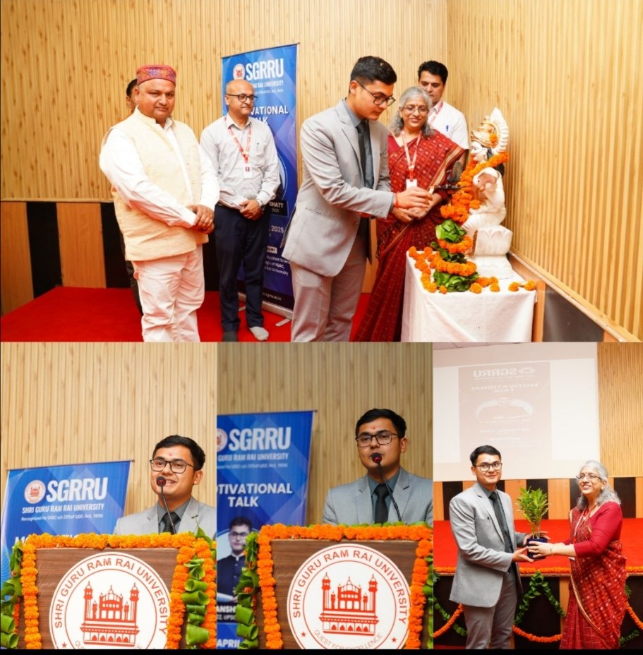 श्री गुरु राम राय विश्वविद्यालय के पटेल नगर आडिटोरियम में प्रेरक वार्ता का आयोजन किया गया। एसजीआरआर विश्वविद्यालय की कुलपति (प्रो.) डाॅ कुमुद सकलानी ने मुख्य वक्ता के रूप में पधारे अंशुल भट्ट का स्वागत किया। उन्होंने कहा कि हर माता पिता का यह सपना होता है कि उनका बेटा आई.ए.एस. बने। अंशुल भट्ट की सफलता यह बताती है कि उनके अथक प्रयासों ने उन्हें यह मुकाम हासिल करने में महत्वपूर्ण भूमिका निभाई। अंशुल भट्ट के जैसे होनहार छात्र आज के युवाओं के लिए रोल माॅडल हैं।