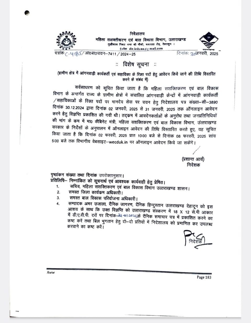 देहरादून ,प्रदेश के विभिन्न जिलों के ग्रामीण क्षेत्रों में आंगनबाडी और सहायिका के पदों के लिए ऑनलाइन आवेदन अब 08 फरवरी तक किया जा सकता है। महिला सशक्तिकरण एवं बाल विकास मंत्री रेखा आर्या के निर्देश पर आवेदन का समय बढ़ाया गया है।