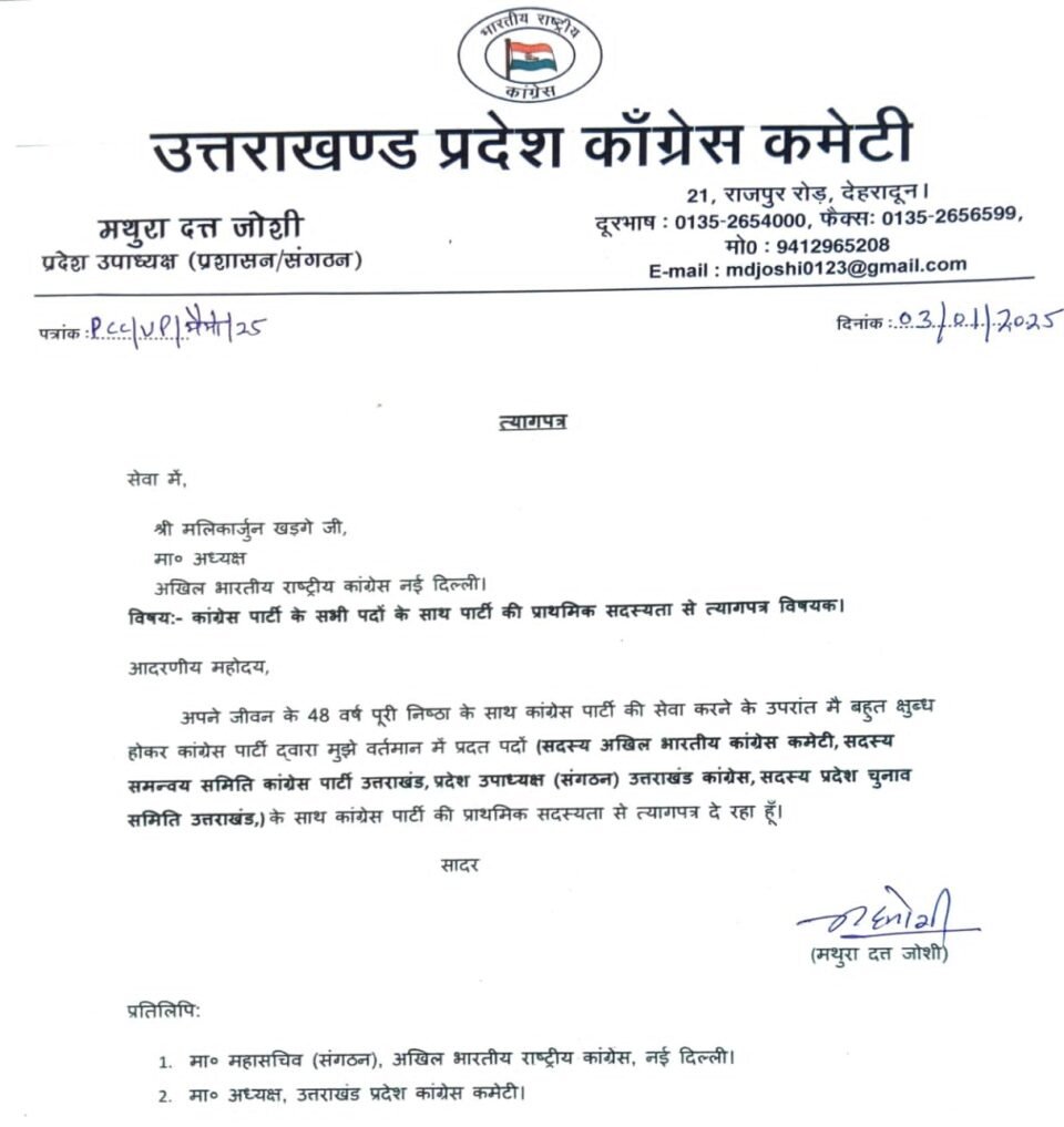 देहरादून। उत्तराखंड कांग्रेस को बड़ा झटका लगा है। प्रदेश उपाध्यक्ष (संगठन) मथुरा दत्त जोशी और वरिष्ठ नेता बिट्टू कर्नाटक ने पार्टी से इस्तीफा दे दिया है। सूत्रों के अनुसार, ये दोनों नेता आज मुख्यमंत्री पुष्कर सिंह धामी और भाजपा प्रदेश अध्यक्ष महेंद्र भट्ट की मौजूदगी में भाजपा की सदस्यता ग्रहण करेंगे।इस घटनाक्रम से प्रदेश कांग्रेस में हलचल मच गई है। कांग्रेस की मुख्य प्रवक्ता गरिमा दसौनी ने मथुरा दत्त जोशी के इस्तीफे पर तीखी प्रतिक्रिया दी। उन्होंने कहा, “पार्टी ने जोशी को काफी कुछ दिया है। ऐसे में उनका पार्टी छोड़ना मां समान कांग्रेस के साथ विश्वासघात है।” बयान देते हुए गरिमा दसौनी बेहद भावुक हो गईं।भाजपा ने आगामी चुनावों के लिए इसे बड़ी राजनीतिक सफलता माना है, जबकि कांग्रेस इसे नैतिकता के खिलाफ करार दे रही है।