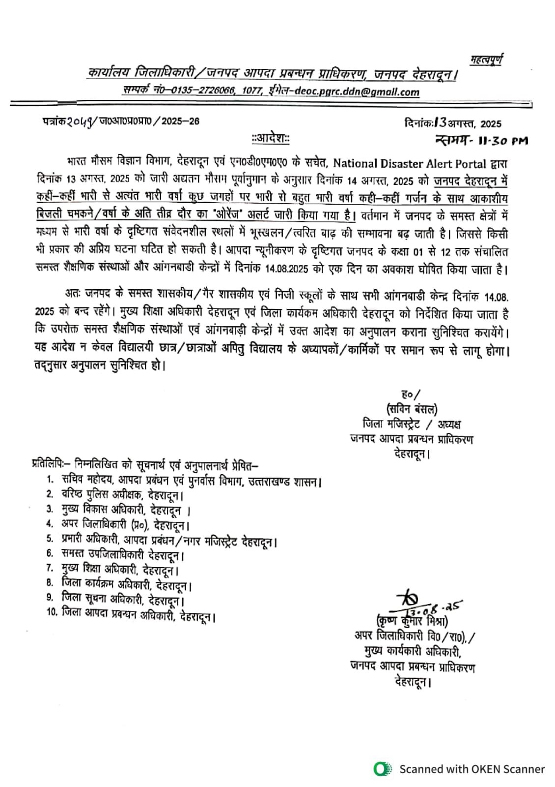 भारी बारिश का ऑरेंज अलर्ट, 14 अगस्त को सभी स्कूल व आंगनबाड़ी बंद