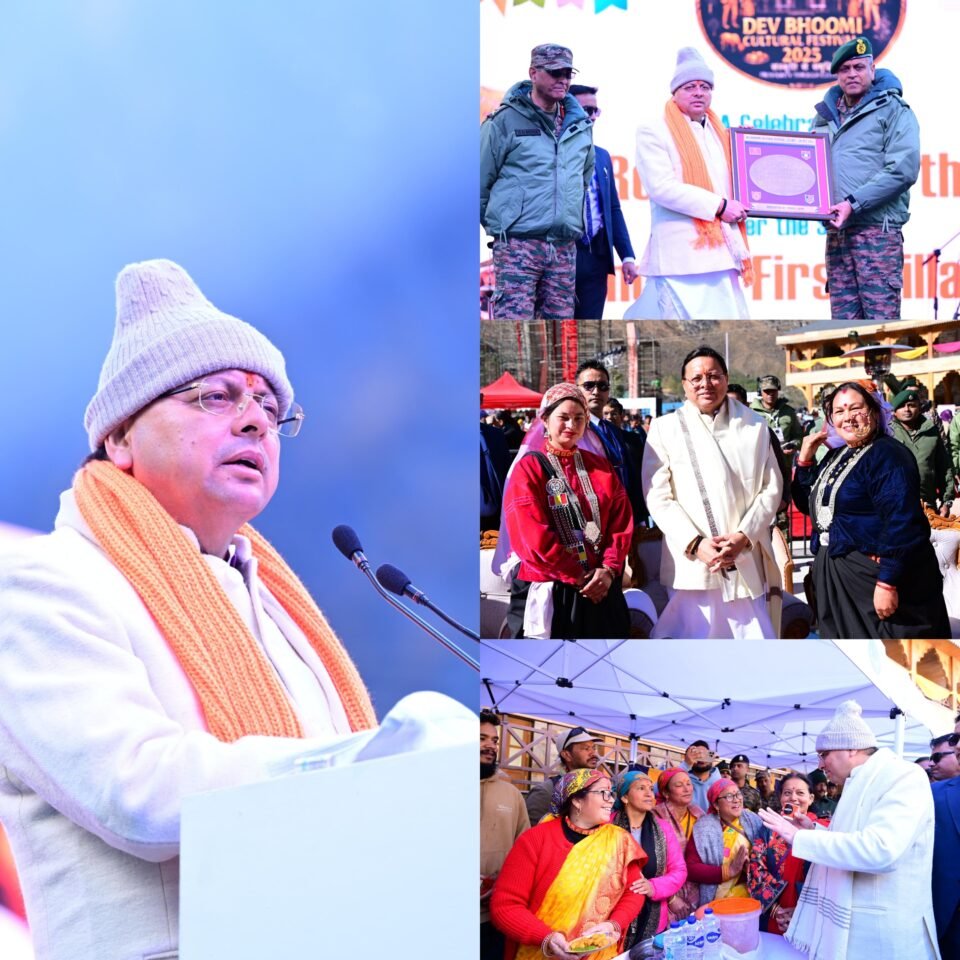 देहरादून/माणा (चमोली),। देश के प्रथम गाँव माणा में आयोजित दो दिवसीय “देवभूमि सांस्कृतिक महोत्सव 2025” का रविवार को भव्य समापन हुआ। मुख्यमंत्री श्री पुष्कर सिंह धामी ने समापन समारोह में मुख्य अतिथि के रूप में प्रतिभाग किया। आयोजन में स्थानीय समुदायों, पर्यटकों एवं गणमान्य अतिथियों की उत्साहपूर्ण सहभागिता देखने को मिली। यह महोत्सव भारतीय सेना एवं उत्तराखंड सरकार के संयुक्त तत्वावधान में आयोजित किया गया।