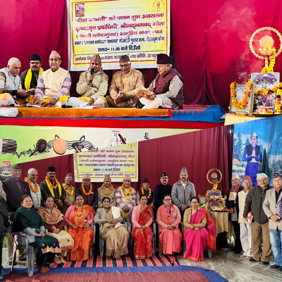 देहरादून,। वैकुण्ठ एकादशी एवं गीता जयंती के पावन अवसर पर उत्तराखंड राज्य नेपाली भाषा समिति के तत्वावधान में गोर्खाली सुधार सभा के मानेकशा सभागार में सामूहिक गीता वाचन का आयोजन किया गया। कार्यक्रम की शुरुआत दीप प्रज्वलन और पुष्प अर्पण से हुई। आचार्य पं. कृष्ण प्रसाद पंथी के सानिध्य में “श्री कृष्णामृत प्रबोधिनी (नेपाली श्लोकानुवाद)” पुस्तक का सामूहिक पाठ हर्षोल्लास और भक्तिभाव के साथ संपन्न हुआ। गोर्खाली सुधार सभा के अध्यक्ष पदम सिंह थापा ने कहा कि गीता का संदेश जीवन को सही दिशा प्रदान करता है और प्रत्येक व्यक्ति को धर्म और राष्ट्र सेवा के लिए सदैव तत्पर रहना चाहिए। भारतीय नेपाली ब्राह्मण समिति के अध्यक्ष पं. राम प्रसाद उपाध्याय ने नेपाली श्लोकानुवाद में प्रकाशित “श्री कृष्णामृत प्रबोधिनी” की सराहना करते हुए कहा कि इससे नेपाली भाषी पाठकों के लिए गीता का अध्ययन सरल हुआ है। उत्तराखंड राज्य नेपाली भाषा समिति के अध्यक्ष मधुसूदन शर्मा ने सभी अतिथियों का आभार व्यक्त करते हुए कहा कि इस प्रकार के आयोजनों से सनातन संस्कृति और परंपराओं के संरक्षण को बढ़ावा मिलेगा। उन्होंने भविष्य में कार्यक्रम को और विस्तृत रूप में आयोजित करने की बात कही। कार्यक्रम का संचालन पूजा सुब्बा चंद ने किया।भगवान आरती के बाद उपस्थित ब्राह्मण धर्माचार्यों का तिलक कर प्रसाद वितरण किया गया। कार्यक्रम में प्रमुख रूप से उपस्थित:आचार्य पं. रामप्रसाद पंथी, आचार्य पं. कृष्ण प्रसाद पंथी, राम प्रसाद उपाध्याय, खगेश्वर प्रसाद पंथी, पदम प्रसाद पंथी, गोविन्द प्रसाद पंथी, बलराम उपाध्याय, जगदीश खनाल, रामजी पौडेल, कर्नल डी.एस. खड़का, श्री बी.के. बराल, गोपाल सिंह छेत्री, राजेंद्र मल्ल, संजय थापा, सुशील भंडारी, उदय ठाकुर, नील कमल चंद, ज्योति कोटिया, श्रीमती शांता पंथी, कविता गुरुंग, पूर्णिमा प्रधान, पी.एन. शेर्पा, अशोक बल्लभ, पूजा सुब्बा चंद आदि।