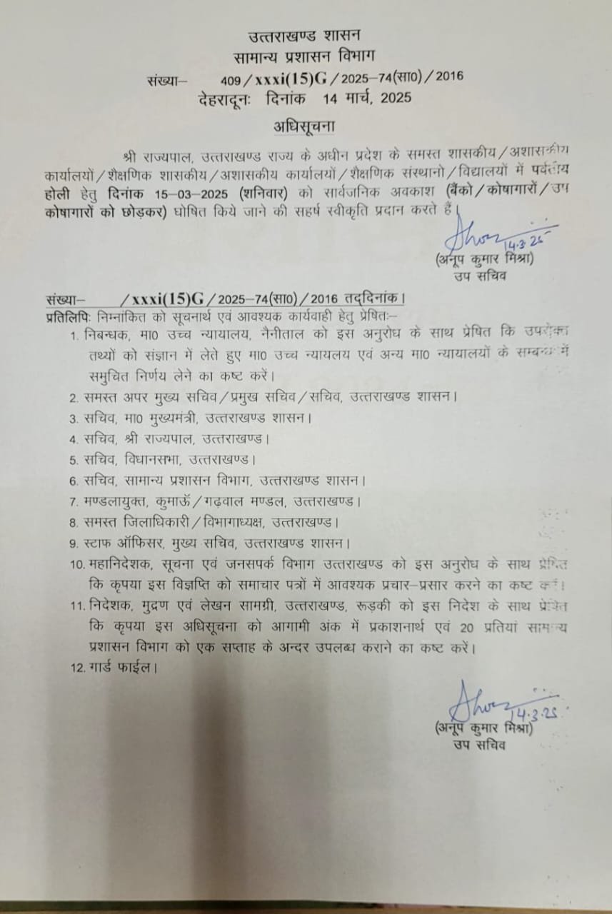 हालांकि, सरकार ने यह भी साफ किया है कि यह अवकाश बैंकों, कोषागारों और उप-कोषागारों पर लागू नहीं होगा। इसका मतलब है कि इन जगहों पर कामकाज सामान्य रूप से चलता रहेगा। यह फैसला न सिर्फ प्रशासनिक व्यवस्था को ध्यान में रखता है, बल्कि जनता की भावनाओं का भी सम्मान करता है।उत्तराखंड की पर्वतीय होली अपने अनूठे अंदाज और लोक परंपराओं के लिए जानी जाती है। ऐसे में सरकार का यह कदम न केवल सांस्कृतिक धरोहर को बढ़ावा देगा, बल्कि लोगों में उत्साह और एकजुटता का संचार भी करेगा।