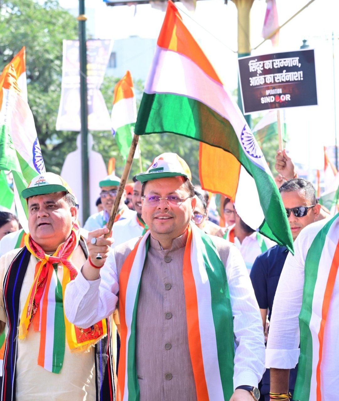देहरादून ,मुख्यमंत्री पुष्कर सिंह धामी के नेतृत्व में बुधवार को शौर्य स्थल चीड़बाग से गांधी पार्क तक भव्य “तिरंगा शौर्य सम्मान यात्रा” का आयोजन किया गया। यह यात्रा हाल ही में भारतीय सशस्त्र बलों द्वारा सफलतापूर्वक चलाए गए “ऑपरेशन सिंदूर” की ऐतिहासिक विजय को समर्पित रही। हजारों की संख्या में आमजन, पूर्व सैनिक, युवा वर्ग एवं मातृशक्ति ने तिरंगे के साथ पद यात्रा में भाग लिया। मुख्यमंत्री ने इस अवसर पर शौर्य स्थल पर पुष्प चक्र अर्पित कर शहीद जवानों को श्रद्धांजलि भी दी।