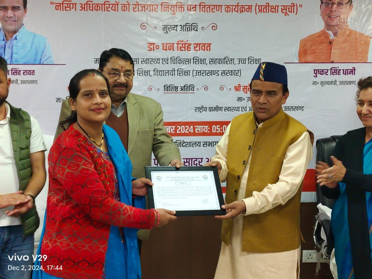 इस अवसर विधायक रायपुर उमेश शर्मा काऊ, महानिदेशक स्वास्थ्य डॉ तारा आर्य, सलाहकार एनएचएम डॉ तृप्ति बहुगुणा, निदेशक स्वास्थ्य डॉ मनीष उप्रेती, सीएमओ देहरादून डॉ संजय जैन, रजिस्ट्रार नर्सिंग काउंसिल डॉ मनीषा ध्यानी सहित अन्य विभागीय अधिकारी व नवनियुक्त नर्सिंग अधिकारी उपस्थित रहे।