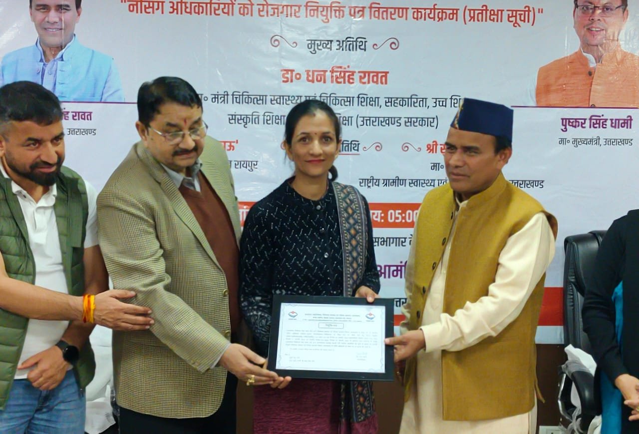 स्वास्थ्य महानिदेशालय में आयोजित नियुक्ति पत्र वितरण कार्यक्रम में प्रदेश के चिकित्सा स्वास्थ्य एवं चिकित्सा शिक्षा मंत्री डॉ. धन सिंह रावत ने आज 40 नर्सिंग अधिकारियों को नियुक्ति पत्र सौंपे। इन सभी चयनित नर्सिंग अधिकारियों को प्रदेशभर के विभिन्न चिकित्सा इकाईयों में तैनाती दे दी गई है। डॉ. रावत ने बताया कि स्वास्थ्य विभाग में चिकित्सा सेवा चयन बोर्ड के माध्यम से नर्सिंग अधिकारियों के 1564 पदों पर भर्ती की गई थी, जिसके सापेक्ष बोर्ड ने 1411 अभ्यर्थियों का अंतिम चयन परिणाम जारी किया था। जिनमें से स्वास्थ्य विभाग ने 1394 नवनियुक्ति नर्सिंग अधिकारियों के नियुक्ति पत्र निर्गत किये जबकि 1354 नर्सिंग अधिकारियों ने ही कार्यभार ग्रहण किया। इसके उपरांत बोडउर् ने कार्यभार ग्रहण न करने वाले अभ्यर्थियों का अभ्यर्थन निरस्त कर प्रतीक्षा सूची में चयनित 40 अभ्यर्थियों की सूची स्वास्थ्य महानिदेशालय को सौंपी। जिन्हें विभिन्न चिकित्सा इकाईयों में तैनाती देते हुये नियुक्ति पत्र वितरित किये गये। जिसमें पिथौरागढ़ जनपद में 8, पौड़ी 6, अल्मोड़ा 5, टिहरी, हरिद्वार, रुद्रप्रयाग व नैनीताल में 4-4, देहरादून 2 तथा उत्तरकाशी, बागेश्वर व चम्पावत में 1-1 नर्सिंग अधिकारी को नियुक्त दी गई है।