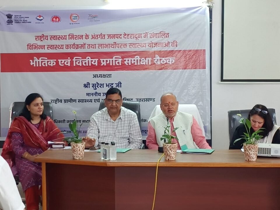 राष्ट्रीय ग्रामीण स्वास्थ्य एवं अनुश्रवण परिषद उत्तराखण्ड के उपाध्यक्ष श्री सुरेश भट्ट जी ने शुक्रवार को जनपद देहरादून में राष्ट्रीय स्वास्थ्य मिशन के अंतर्गत संचालित स्वास्थ्य कार्यक्रमों एवं योजनाओं की समीक्षा बैठक ली। बैठक की अध्यक्षता करते हुए श्री भट्ट ने जनपद में अंतिम व्यक्ति तक स्वास्थ्य सेवाओं का लाभ पहुंचाने के निर्देश दिये। बैठक में जनपद देहरादून के समस्त अपर मुख्य चिकित्सा अधिकारी, जनपद स्तरीय अधिकारी एवं ब्लॉक स्तरीय चिकित्सा अधीक्षकों व प्रभारी चिकित्सा अधिकारियों ने प्रतिभाग किया।
