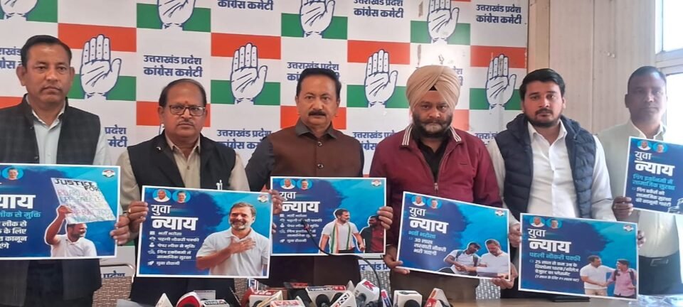 देहरादूनः- प्रदेश कांग्रेस कमेटी के अध्यक्ष करन माहरा ने आज प्रदेश कांग्रेस मुख्यालय में प्रेस को संबोधित करते हुए भारतीय राष्ट्रीय कांग्रेस द्वारा देश के युवाओं के लिए दिये गये पॉच ऐतिहासिक ग्रारंटियों का जिक्र करते हुए कहा कि लोकसभा चुनाव में देश के युवाओं का समर्थन यदि कांग्रेस गठबंधन को मिला और केन्द्र में कांग्रेस गठबंधन की सरकार बनी तो निश्चित रूप से देश के युवाओं का भविष्य उज्जवल होगा। उन्होंने कहा कि कांग्रेस के राष्ट्रीय अध्यक्ष श्री मलिकार्जुन खड़गे एवं पूर्व अध्यक्ष श्री राहुल गांधी जी ने केन्द्र में सरकार बनने पर युवाओं के भविष्य को उज्जवल बनाये जाने हेतु निम्न गारंटिया। दी है।