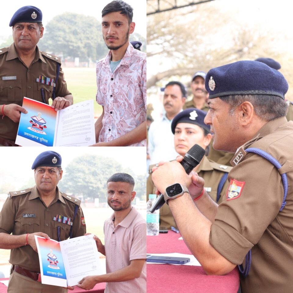 देहरादून। पुलिस लाइन में आयोजित कार्यक्रम में वरिष्ठ पुलिस अधीक्षक (एसएसपी) द्वारा उत्तराखंड पुलिस आरक्षी नागरिक पुलिस/पीएसी सीधी भर्ती–2025 में चयनित 417 अभ्यर्थियों को नियुक्ति पत्र प्रदान किए गए। एसएसपी ने सभी चयनित अभ्यर्थियों को पुलिस परिवार में शामिल होने पर शुभकामनाएं देते हुए उनके उज्ज्वल भविष्य की कामना की। उन्होंने कहा कि वर्तमान समय में पुलिस के सामने कई नई चुनौतियां सामने आ रही हैं, जिनका प्रभावी ढंग से सामना करने के लिए पुलिसकर्मियों का शारीरिक और मानसिक रूप से सुदृढ़ होना अत्यंत आवश्यक है।
