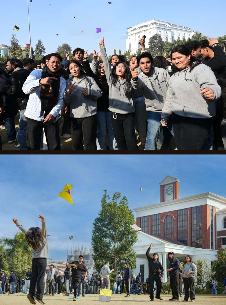 देहरादून , ग्राफिक एरा में मकर संक्रांति पर काइट फेस्ट का आयोजन किया गया। आज ग्राफिक एरा डीम्ड यूनिवर्सिटी के मेन ग्राउंड में काइट फेस्ट का आयोजन किया गया। काइट फेस्ट में बड़ी संख्या में छात्र-छात्राओं ने भाग लिया और पतंगबाजी का भरपूर आनंद लेते दिखे। हरी, नीली, लाल, पीली, तिरंगे और विभिन्न डिजाइनों की पतंगों से पूरा आसमान सजा नजर आया। कोई पूरे जोश और ध्यान के साथ चरखी संभालता दिखाई दिया तो कोई आसमान में उड़ती पतंगों पर नजरें टिकाए उन्हें काटने की कोशिश करता दिखा। पतंगबाजी के साथ साथ संगीत और नृत्य ने आयोजन को और भी जीवंत बना दिया। छात्र-छात्राओं ने संगीत की धुनों पर खूब झूमा गाया और दोस्तों के साथ काइट फेस्ट का भरपूर आनंद लिया।
