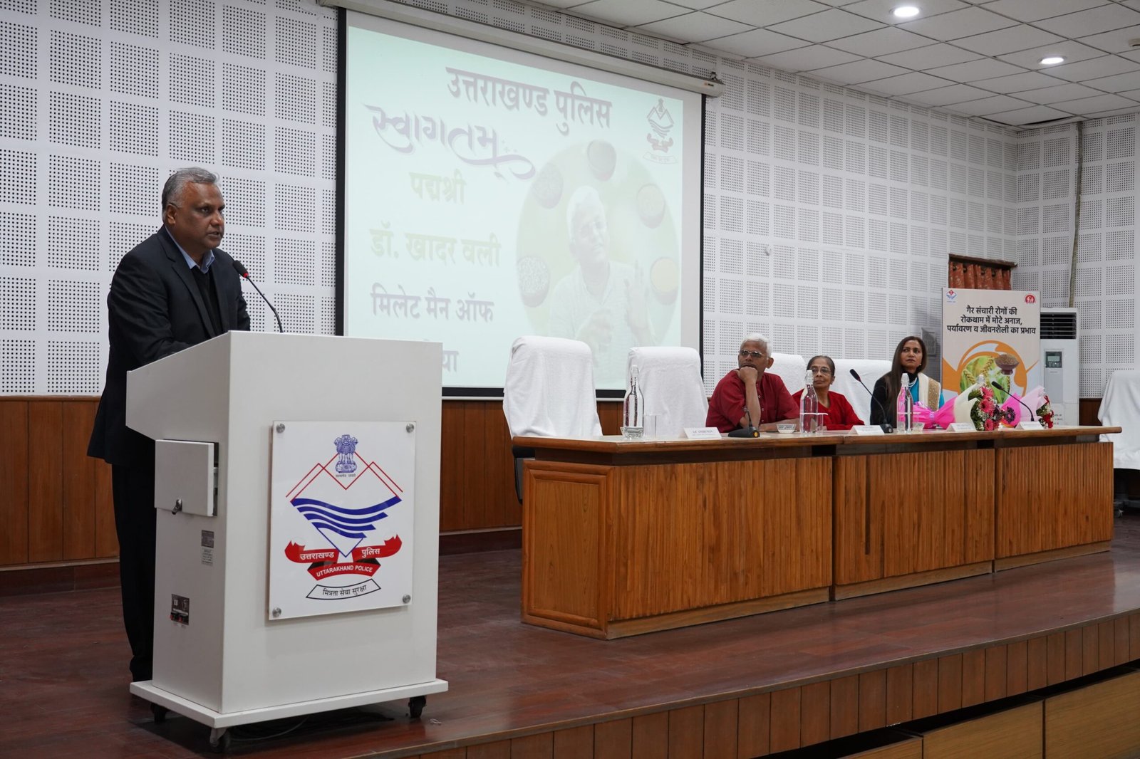 श्री वी0 मुरूगेशन, अपर पुलिस महानिदेशक, अपराध एवं कानून व्यवस्था, उत्तराखण्ड महोदय ने डॉ. खादिर अली को उनकी सेवाओं और योगदान के लिए प्रतीक चिन्ह भेंट कर सम्मानित किया। समारोह के अंत में उपस्थित सभी पुलिस अधिकारियों व कर्मचारियों ने मिलेट्स को अपने आहार का हिस्सा बनाने और इसे बढ़ावा देने का संकल्प लिया।*