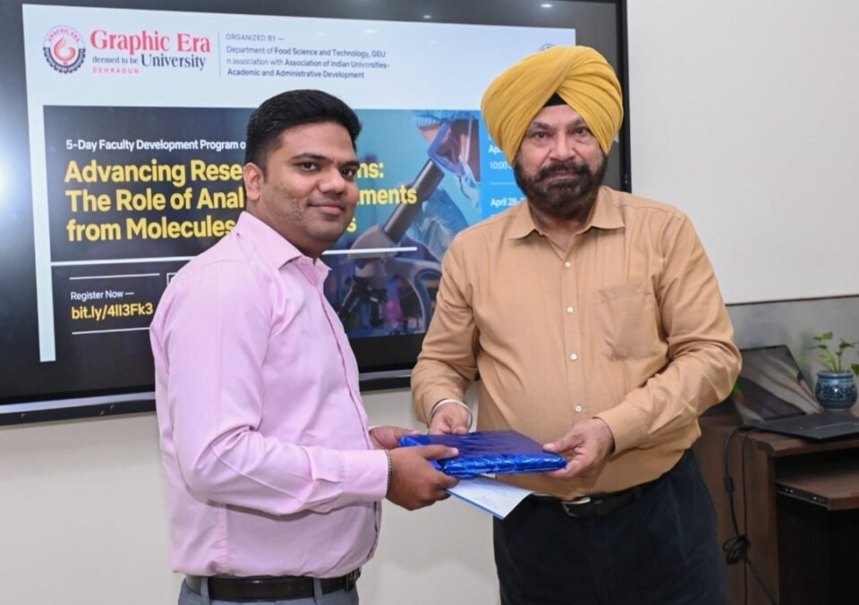 ग्राफिक एरा डीम्ड यूनिवर्सिटी में चल रही पांच दिवसीय राष्ट्रीय एफडीपी के आखिरी दिन आज, कुलपति डॉ. नरपिंदर सिंह ने कहा कि आज के आधुनिक जगत में अनेकों अवसर उपलब्ध हैं। उन्होंने शिक्षक-शिक्षिकाओं व शोधार्थियों को आगे आकर कार्य करने, नये आइडियाज विकसित करने व शोध करने के लिए प्रेरित किया। एजिलेंट टेक्नोलॉजी के प्रोडक्ट स्पेशलिस्ट सचिन गंगवार ने सेपरैशन टेक्निक और क्वालिटी एनालिसिस पर संबोधित किया।