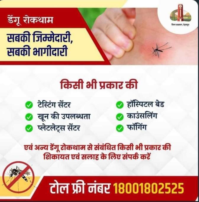 जिलाधिकारी ने समस्त जनमानस से अनुरोध किया है कि डेंगू से संबंधित किसी भी प्रकार की समस्या एवं शिकायत तथा चिकित्सकीय परामर्श के लिए टोल फ्री नंबर 1800 1802525 पर संपर्क किया जा सकता है।