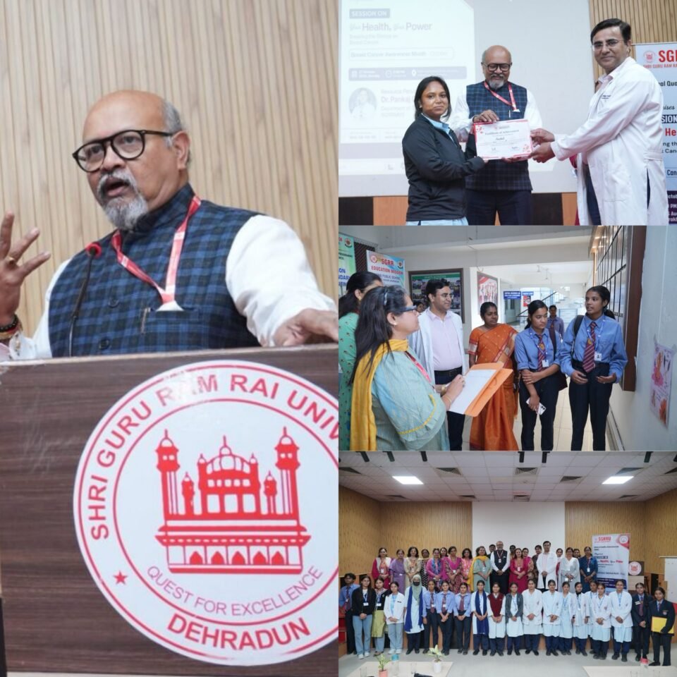 देहरादून, स्तन कैंसर जागरूकता माह के अंतर्गत, श्री गुरु राम राय विश्वविद्यालय के आंतरिक गुणवत्ता आश्वासन प्रकोष्ठ (IQAC) द्वारा पोस्टर मेकिंग प्रतियोगिता एवं अतिथि व्याख्यान का आयोजन किया गया। इस कार्यक्रम का उद्देश्य छात्रों और अध्यापकों में स्तन कैंसर के प्रति जागरूकता बढ़ाना और समय पर जाँच एवं आत्म-परीक्षण के महत्व को समझाना था।
