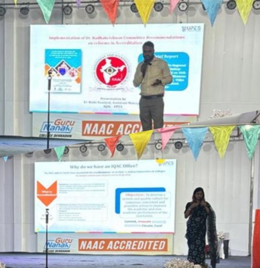 कार्यशाला का संचालन सुनील कुमार मलिक ने किया। विशेष अतिथि वक्ता डॉ. गीतांजली राघव, सीनियर मैनेजर – IQAC, UPES तथा इंजीनियर ऋषि नटियाल, असिस्टेंट मैनेजर – IQAC, UPES रहे। डॉ. राघव ने निरंतर गुणवत्ता सुधार, नवाचार और शोध संवर्धन पर बल दिया, वहीं श्री नटियाल ने NAAC सुधार 2024 और “लाइट बट टाइट” पद्धति पर विस्तार से जानकारी दी।