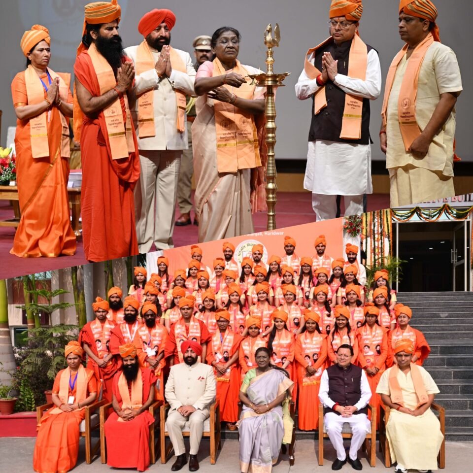 देहरादून/हरिद्वार। राष्ट्रपति द्रौपदी मुर्मु ने पतंजलि विश्वविद्यालय, हरिद्वार के द्वितीय दीक्षांत समारोह में स्वर्ण पदक प्राप्त विद्यार्थियों को सम्मानित किया। समारोह में कुल 1454 विद्यार्थियों को उपाधि प्रदान की गई, जिनमें 62 को विद्या वारिधि, 3 को विद्या वाचस्पति, 615 को परास्नातक और 774 को स्नातक उपाधि मिली।राष्ट्रपति ने पदक विजेताओं और उनके अभिभावकों व शिक्षकों की सराहना करते हुए कहा कि इस वर्ष 64 प्रतिशत उपाधि प्राप्तकर्ता छात्राएँ हैं, जो विकसित भारत में महिला सशक्तिकरण का प्रतीक है। उन्होंने कहा कि पतंजलि विश्वविद्यालय योग, आयुर्वेद और भारतीय ज्ञान परंपरा को आधुनिक शिक्षा से जोड़कर स्वस्थ और संस्कारित समाज निर्माण में योगदान दे रहा है।राज्यपाल लेफ्टिनेंट जनरल गुरमीत सिंह (से नि.) ने राष्ट्रपति का स्वागत करते हुए कहा कि देवभूमि उत्तराखंड योग, आयुर्वेद और अध्यात्म की प्राण भूमि है। मुख्यमंत्री श्री पुष्कर सिंह धामी ने राष्ट्रपति का स्वागत करते हुए कहा कि राज्य स्थापना के 25वें वर्ष में उनका सान्निध्य गौरव का विषय है। उन्होंने विद्यार्थियों से आह्वान किया कि वे अपने ज्ञान और कौशल का उपयोग समाज व राष्ट्र के विकास में करें। समारोह में पतंजलि विश्वविद्यालय के कुलाधिपति स्वामी रामदेव, कुलपति आचार्य बालकृष्ण, सांसद त्रिवेंद्र सिंह रावत, डॉ. कल्पना सैनी सहित अनेक गणमान्य उपस्थित रहे।
