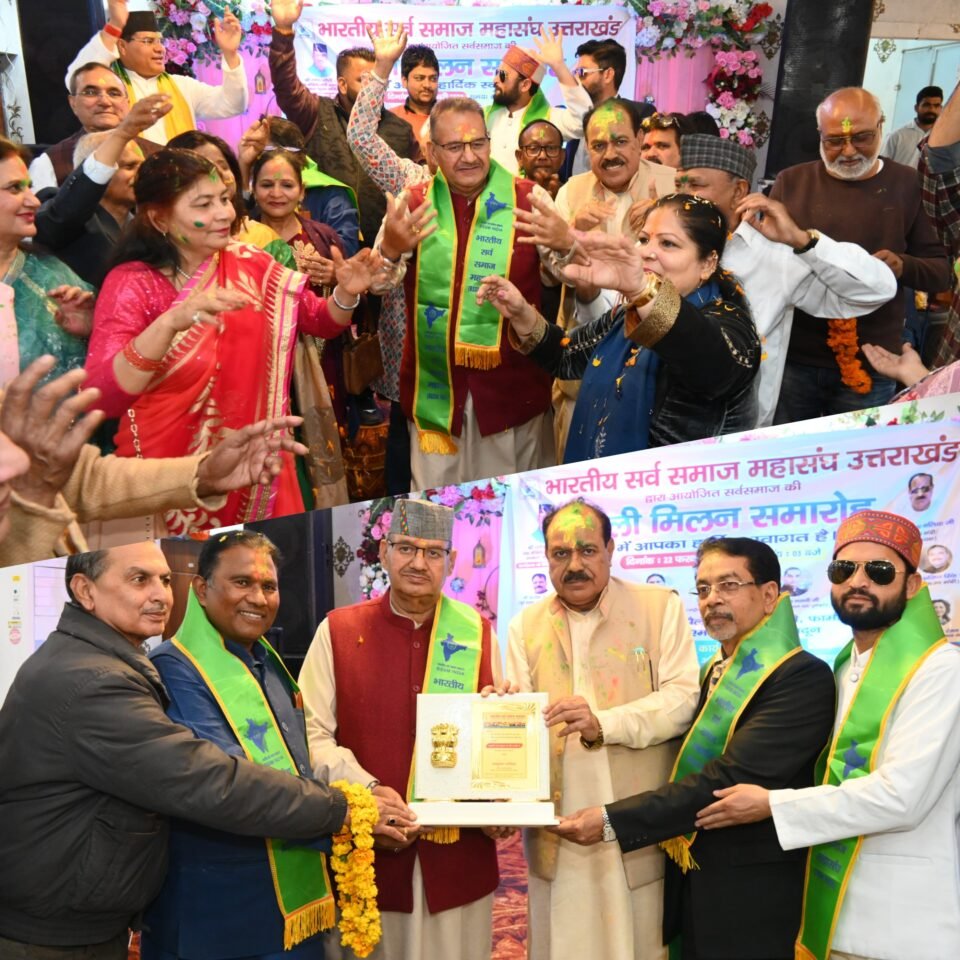 देहरादून। जीएमएस रोड स्थित आर्य पैलेस में भारतीय सर्व समाज महासंघ द्वारा आयोजित भव्य होली मिलन समारोह उत्साह, उमंग और सामाजिक समरसता के संदेश के साथ संपन्न हुआ। कार्यक्रम में प्रदेश के कैबिनेट मंत्री गणेश जोशी, कैंट विधायक सविता कपूर तथा भारतीय सर्व समाज महासंघ के राष्ट्रीय अध्यक्ष रामकुमार वालिया सहित अनेक गणमान्य व्यक्तियों ने सहभागिता की।