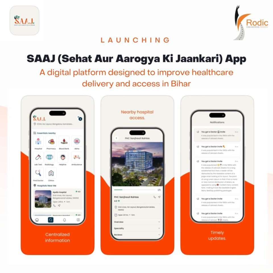 देहरादून- रोडिक कंसल्टेंट्स, अग्रणी इंजीनियरिंग एवं डिजिटल इंफ्रास्ट्रक्चर कंसल्टिंग कंपनी, ने साज़ ‘SAAJ’ (सेहत और आरोग्य की जानकारी) ऐप विकसित किया है जो कि बिहार के सभी निवासियों को स्वास्थ्य सेवाओं तक सहज पहुंच बनाने के लिए एक उत्कृष्ट डिजिटल प्लेटफार्म है। बिहार सरकार के लिए विकसित किया गया यह ऐप रोडिक कंसल्टेंट्स की अत्याधुनिक तकनीक का उपयोग करके महत्वपूर्ण स्वास्थ्य सेवा आवश्यकताओं को पूरा करने की प्रतिबद्धता को दर्शाता है और सभी निवासियों के लिए स्वास्थ्य सेवाओं के अनुभव को बेहतर बनाने का काम करता है।