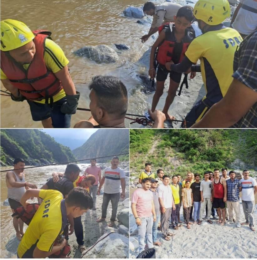 एसडीआरएफ टीम द्वारा घटनास्थल पर पहुंचकर स्थानीय पुलिस के साथ मिलकर संयुक्त रेस्क्यू अभियान चलाते हुए नदी किनारे फंसे तीनों युवकों को रोप रिवर क्रॉसिंग टेकनीक से नदी पार कराकर सुरक्षित स्थान पर पहुँचाया गया ।