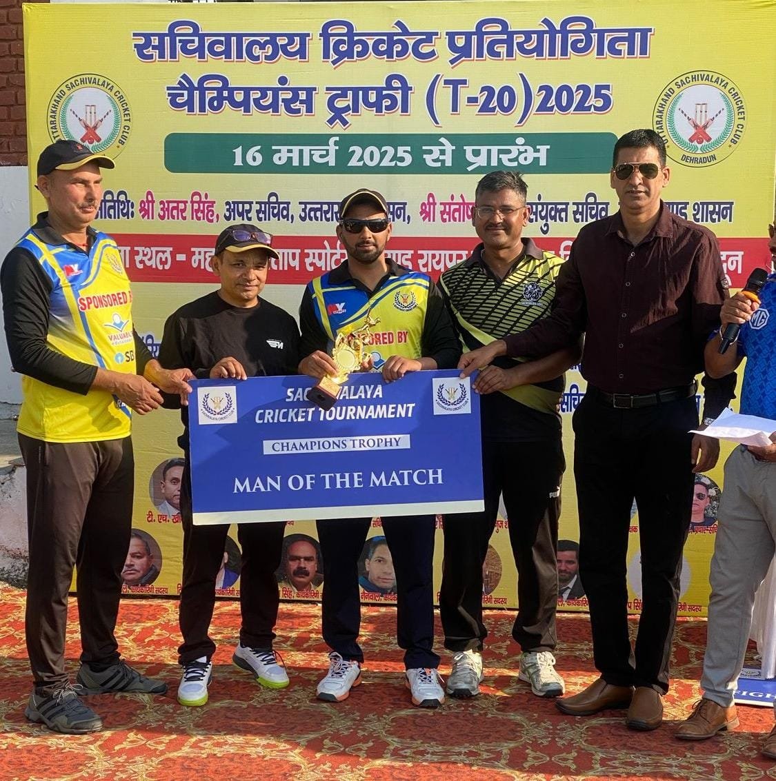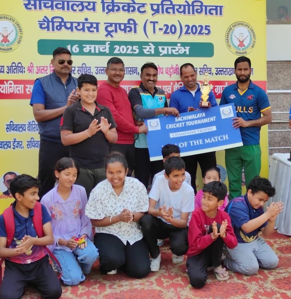 देहरादून,सचिवालय चैंपियंस ट्रॉफी में आज महाराणा प्रताप क्रिकेट ग्राउंड में लीग स्टेज के 02 मैच खेले गए। पहला मैच सचिवालय ईगल और सचिवालय बुल्स के बीच खेला गया, जिसमें ईगल पहले बल्लेबाजी करते हुए कुल 106 रनों पर ऑल आउट हो गई, देवेंद्र ने 34 रन बनाए वही मुकेश रावत और सुनील तोमर ने 03_03 विकेट लिए। लक्ष्य का पीछा करने उतरी बुल्स की टीम ने 12 ओवरों में 05 विकेट खोकर लक्ष्य प्राप्त कर लिया। अमीन ने 42 और सुनील तोमर ने 25 रन बनाए। हिमांशु नेगी ने 3 और आई पी सिंह ने 02 विकेट लिए।