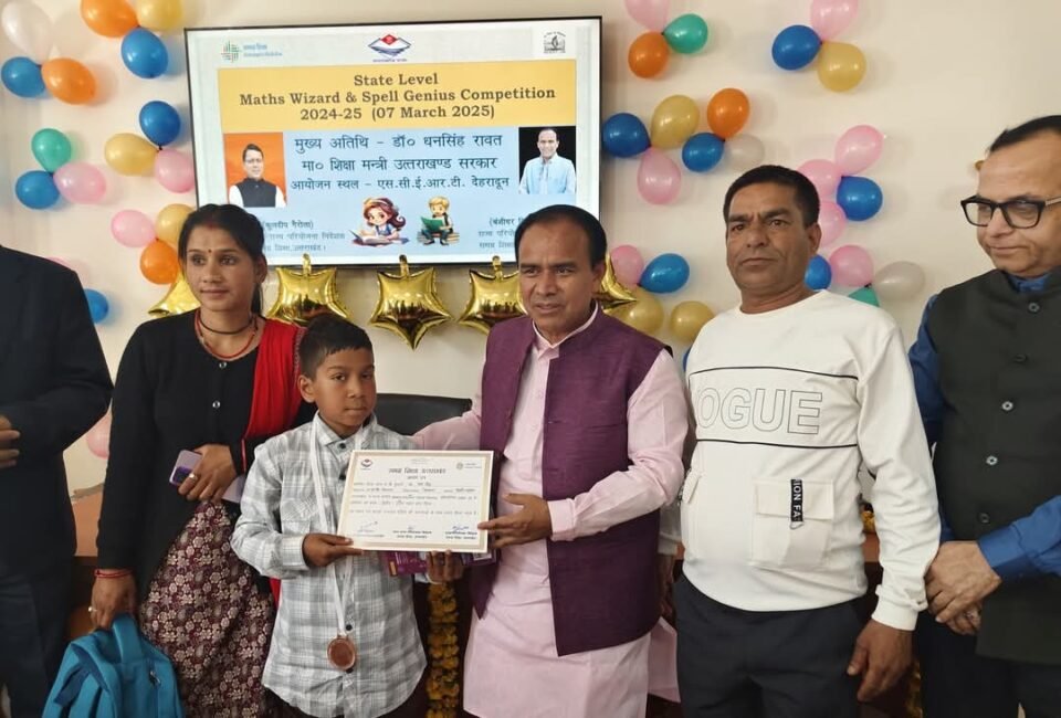 एससीईआरटी उत्तराखंड के सभागार में राज्य परियोजना समग्र शिक्षा उत्तराखंड द्वारा राज्य स्तरीय मैथ्स विजार्ड एवं स्पेल जीनियस प्रतियोगिता आयोजित की गई। कार्यक्रम का उद्घाटन डॉ धन सिंह रावत जी माननीय शिक्षा मंत्री उत्तराखंड सरकार द्वारा दीप प्रज्वलित कर किया गया। अपर राज्य परियोजना निदेशक श्री कुलदीप गैरोला जी द्वारा मुख्य अतिथियों का स्वागत कर कार्यक्रम की रूपरेखा रखी गई। उन्होंने बताया कि राज्य स्तरीय मैथ्स विजार्ड एवं स्पेल जीनियस प्रतियोगिता में 13 जनपदों के 26-26 प्रतिभागियों एवं प्रति जनपद 2 एस्कॉर्ट शिक्षक शिक्षिकाओं ने प्रतिभाग किया। प्रतियोगिता में स्पेल जीनियस के अंतर्गत डिक्टेशन, फ़िल इन द ब्लैंक्स एवं रैपिड फायर राउंड आयोजित किए गए। स्पेल जीनियस प्रतियोगिता में शिखर अवस्थी ,राप्रावि डांडा लाखोंड देहरादून प्रथम, सागर कुमार राप्रावि खलियान रुद्रप्रयाग द्वितीय, नितिन कुमार पी एम श्री राआप्रावि कपकोट ने तृतीय स्थान प्राप्त किया। मैथ्स विजार्ड प्रतियोगिता में हर्षित राप्रावि सौला अल्मोड़ा प्रथम स्थान ,उदित जोशी राप्रावि गुरना बिन पिथौरागढ़ द्वितीय स्थान तथा अंश सिंह रा प्रा वि तितराना टिहरी ने तृतीय स्थान प्राप्त किया। माननीय शिक्षा मंत्री जी द्वारा प्रथम तथा द्वितीय स्थान प्राप्त करने वाले प्रतिभागियों को टेबलेट, प्रमाण पत्र, रिश्ट वॉच ,स्कूल बैग ,ट्रैक सूट एवं स्टेशनरी वितरित किए गए। अन्य सभी प्रतिभागियों को स्कूल बैग, रिष्ट वाच, ट्रैक सूट ,तथा स्टेशनरी वितरित की गई।इ