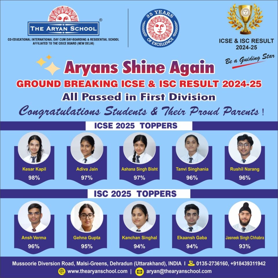 द आर्यन स्कूल की चेयरपर्सन सिमी गुप्ता, वाइस चेयरपर्सन विभोर गुप्ता और प्रिंसिपल बी. दासगुप्ता ने सभी छात्रों को उनकी शानदार उपलब्धियों पर हार्दिक बधाई और शुभकामनाएं दीं।