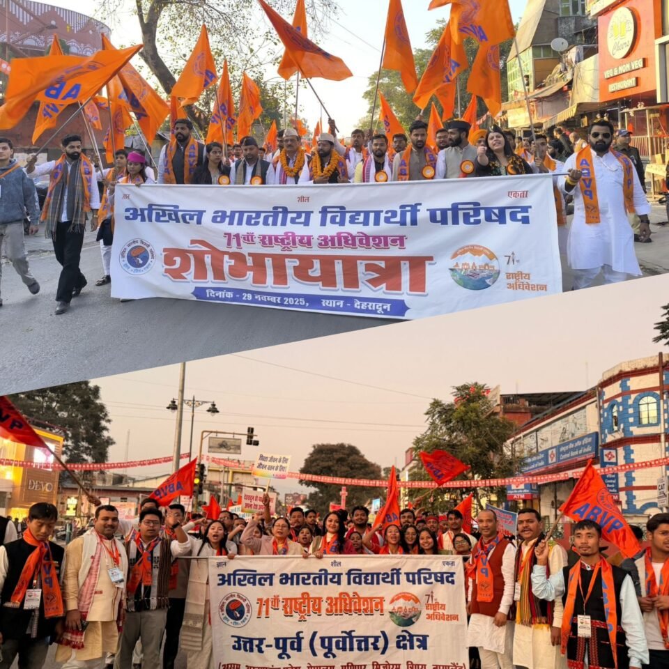 देहरादून। अखिल भारतीय विद्यार्थी परिषद (अभाविप) के 71वें राष्ट्रीय अधिवेशन के दूसरे दिन परेड ग्राउंड से दर्शनलाल चौक तक 4.5 किमी लंबी शोभायात्रा निकाली गई। सभी राज्यों से आए 1500 से अधिक छात्र–छात्राओं की सहभागिता से यह यात्रा लघु भारत का अद्भुत स्वरूप प्रस्तुत करती दिखी। मार्गभर देहरादूनवासियों ने पुष्पवर्षा कर यात्रियों का स्वागत किया और ‘भारत माता की जय’ के उद्घोष से माहौल देशभक्ति से सराबोर रहा।