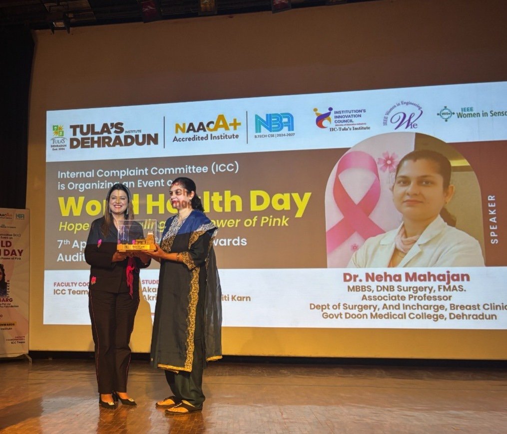 देहरादून, विश्व स्वास्थ्य दिवस के उपलक्ष्य में तुलाज़ इंस्टीट्यूट की आंतरिक शिकायत समिति (आईसीसी) द्वारा “होप एंड हीलिंग: द पावर ऑफ पिंक” विषय पर एक प्रभावशाली जागरूकता कार्यक्रम आयोजित किया गया। इस कार्यक्रम का मुख्य उद्देश्य स्तन कैंसर के प्रति जागरूकता फैलाना और समय पर पता लगाना व सहयोग के महत्व को उजागर करना था।