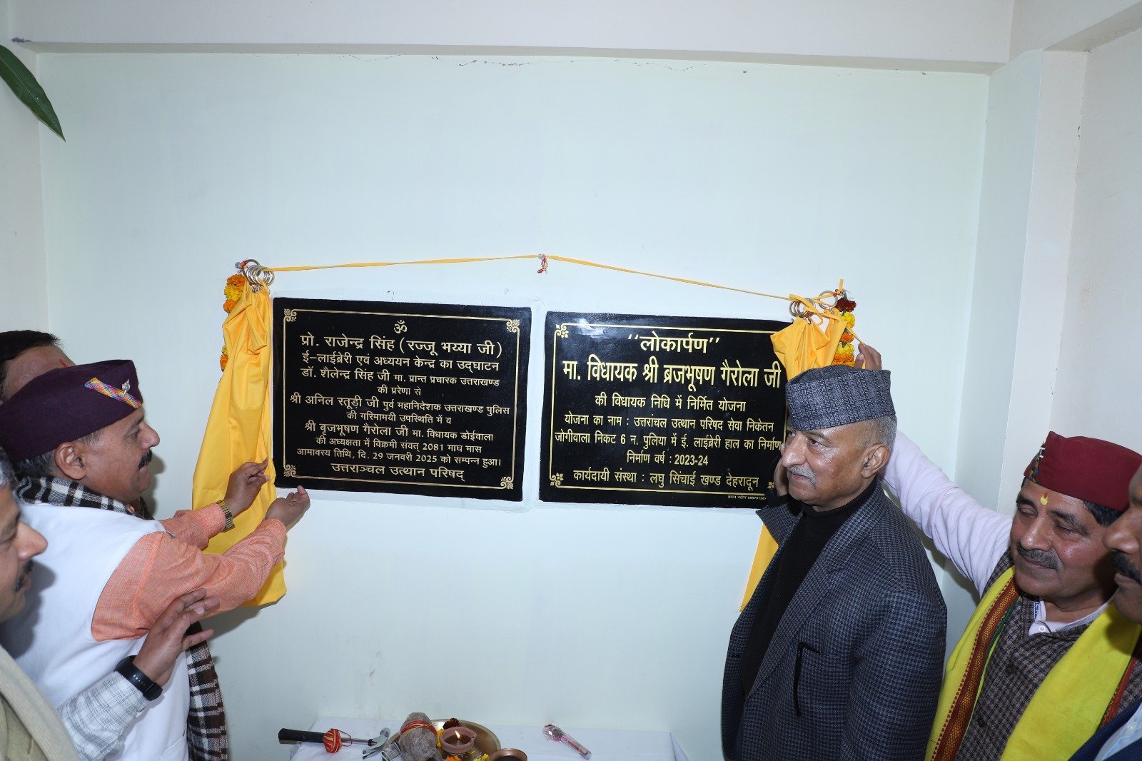 मुख्य अतिथि पूर्व पुलिस महानिदेशक अनिल रतूड़ी उपस्थित एवं कार्यक्रम के मुख्य वक्ता प्रांत प्रचारक डा० शैलेन्द्र जी के द्वारा उत्तरांचल उत्थान परिषद के कार्यकर्ताओं एवं अन्य गणमान्य अतिथियों की उपस्थिति में मंत्रोच्चारण के साथ पूजन कर लाइब्रेरी हाल के लोकार्पण एवं ई-लाइब्रेरी एवं अध्ययन केन्द्र के शुभारंभ के शिलापटों का अनावरण किया गया। ।*