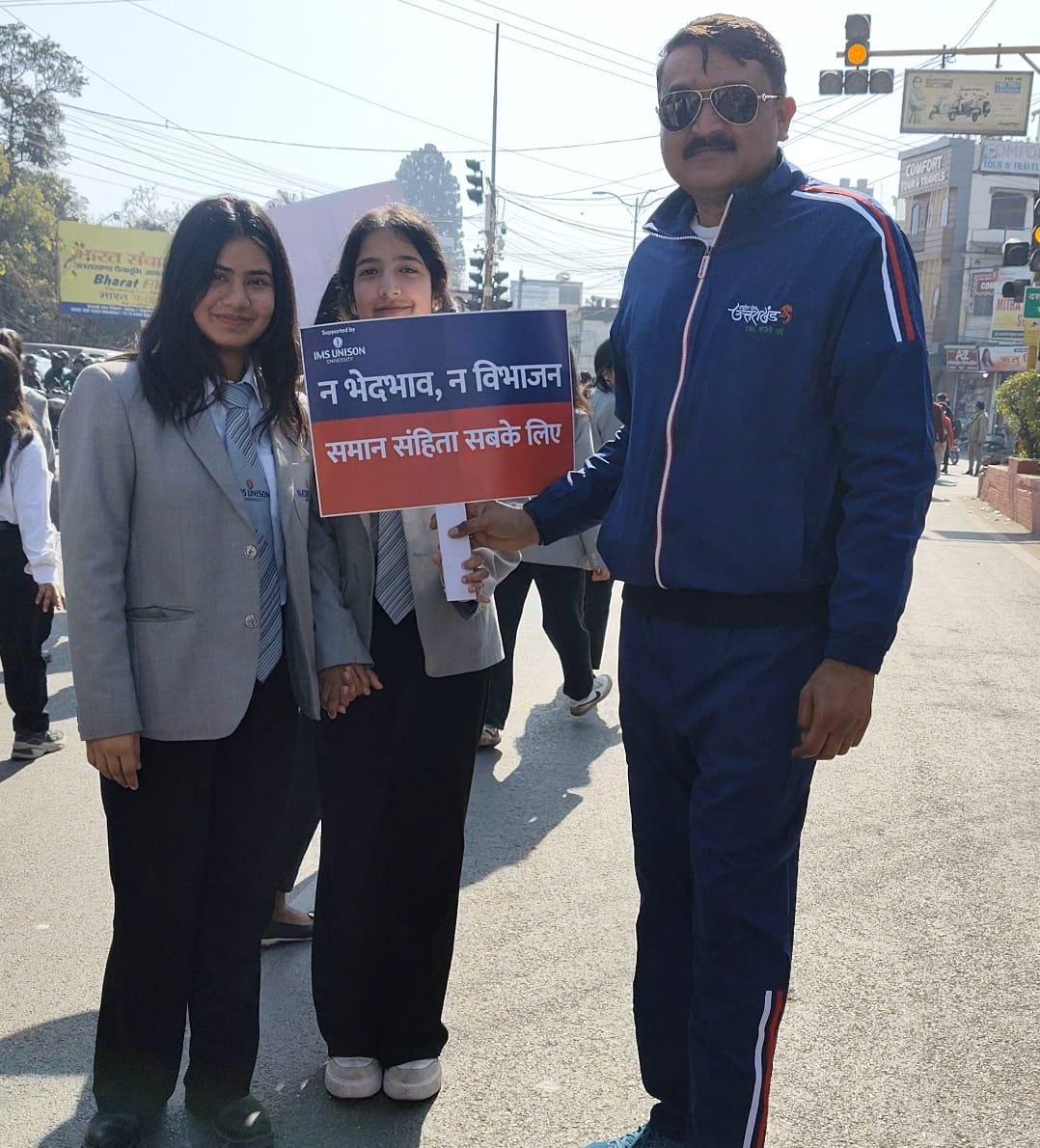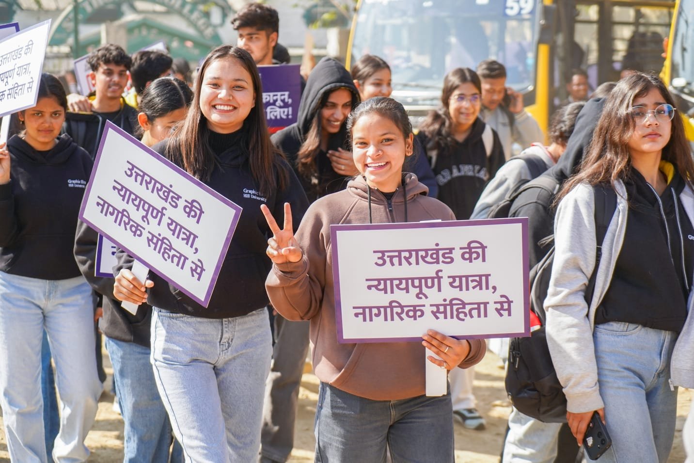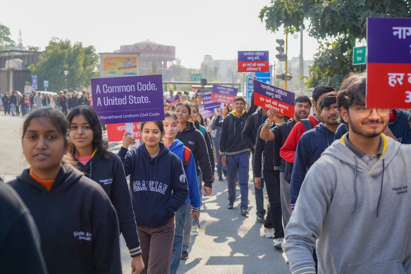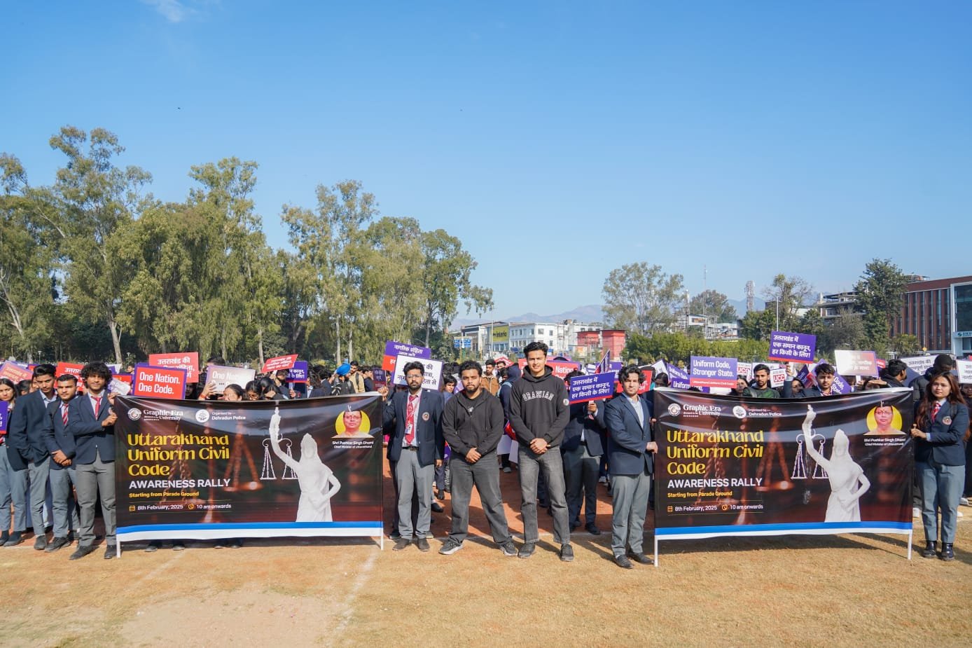 यू0सी0सी0 के सम्बंध में आमजन को जागरूक करने के उद्देश से निकाली गई जागरूकता रैली परेड ग्राउंड से प्रारम्भ होकर दर्शनलाल चौक, घंटाघर होते हुए रेर्जस ग्राउंड में समाप्त हुई। रैली के दौरान ग्राफ़िक एरा तथा डी०आई०टी० के छात्रों द्वारा पोस्टर, बैनर्स तथा स्लोगन के माध्यम से ’’ वन नेशन वन कोड ’’ का समर्थन करते हुए आमजन को यू०सी०सी० के संबंध में किया जागरूक किया गया। इस दौरान उनके द्वारा यू०सी०सी० को कानूनी एकरूपता और सामाजिक न्याय को बढ़ावा देने वाला कानून बताते हुए नागरिक कानूनों में समानता और निष्पक्षता सुनिश्चित करने में यू०सी०सी० के महत्व के संबंध में आमजन को जागरूक किया।